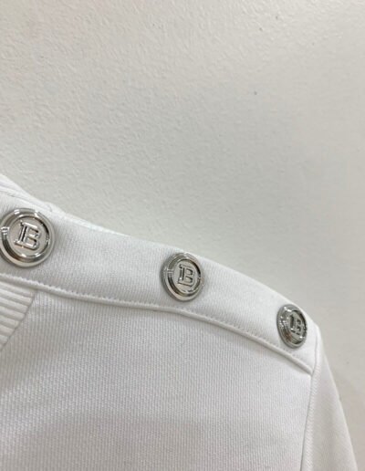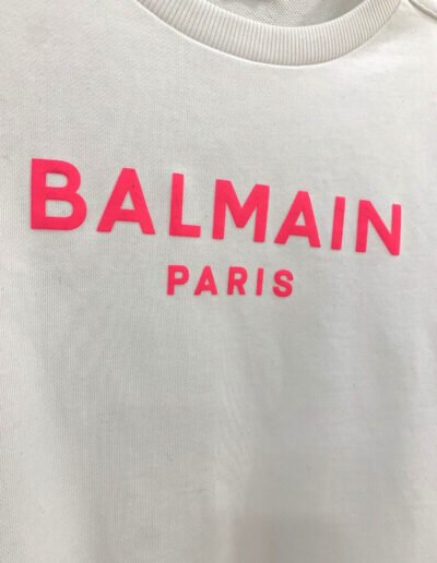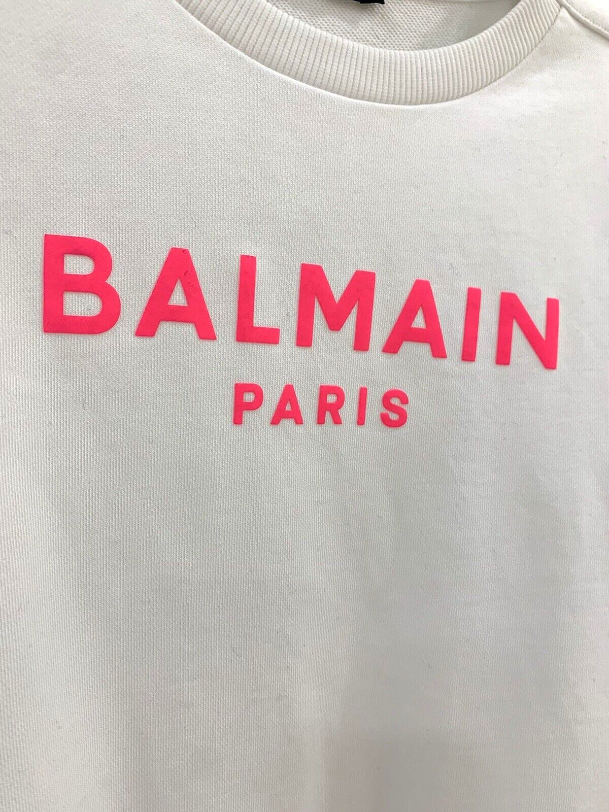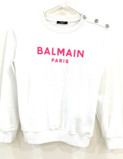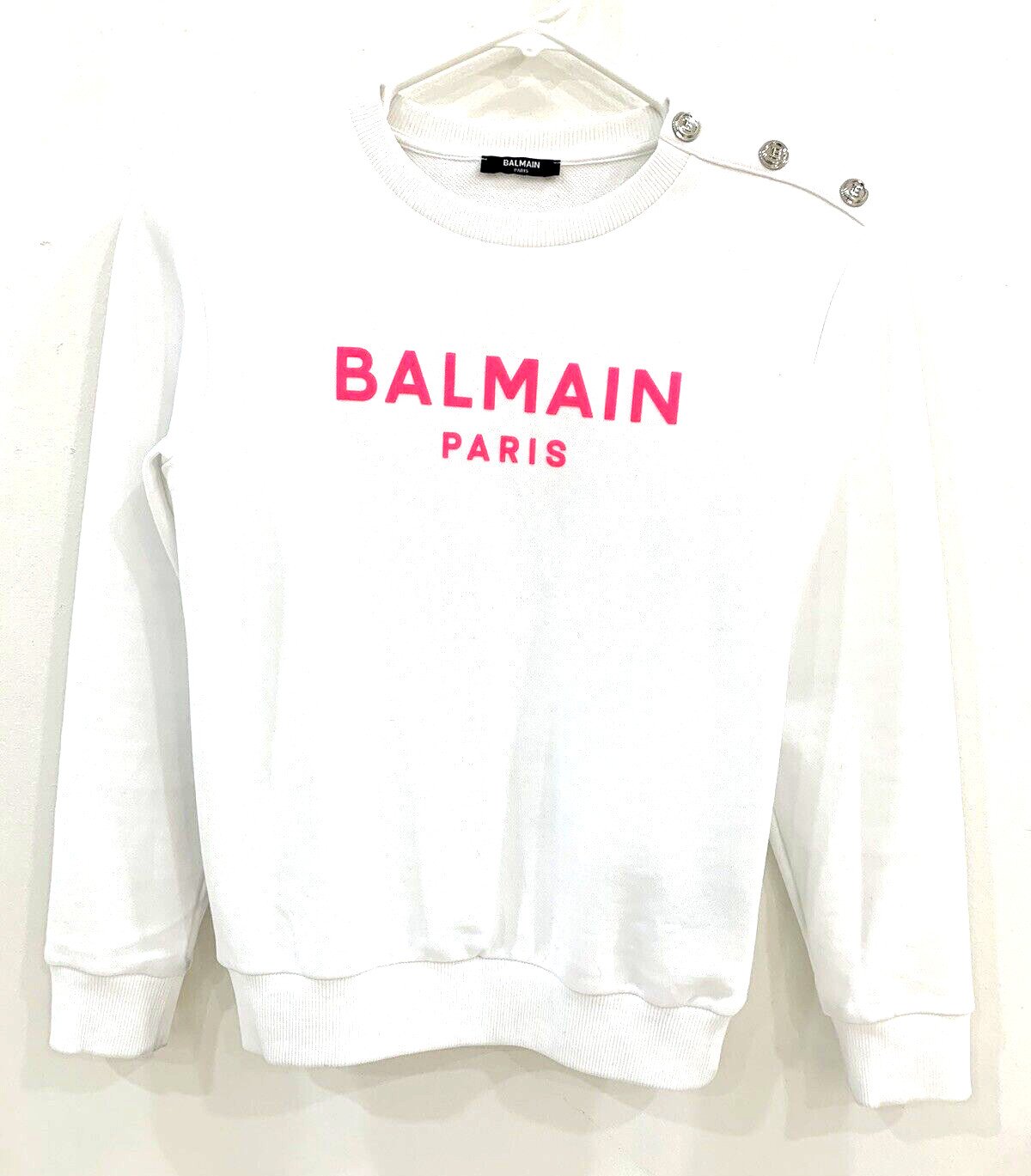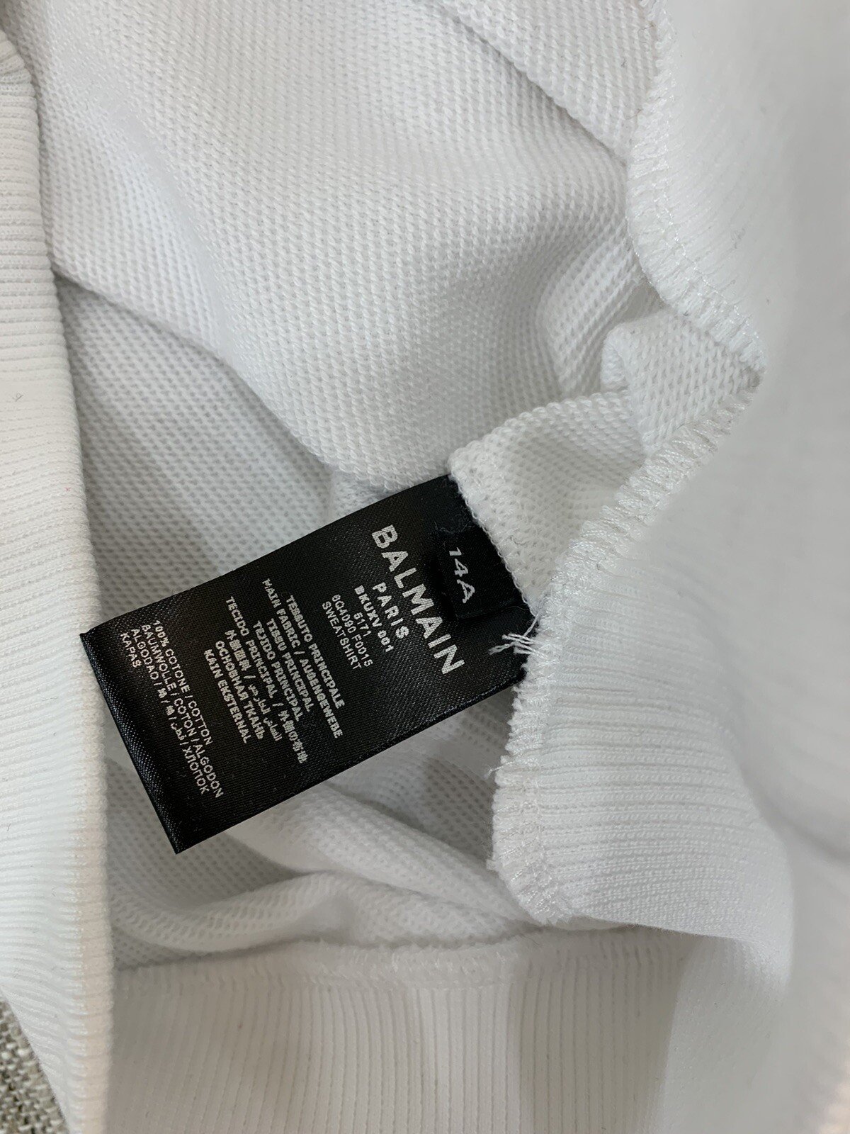 The BALMAIN Kids White Logo Sweatshirt brings luxury and comfort together in one playful piece. Crafted from soft, high-quality fabric, it features a bold logo print on the front and stylish button accents at the shoulder for easy wear. Designed for both style and movement, this sweatshirt is a chic, versatile addition to any child’s wardrobe.