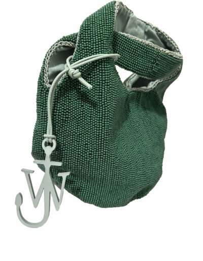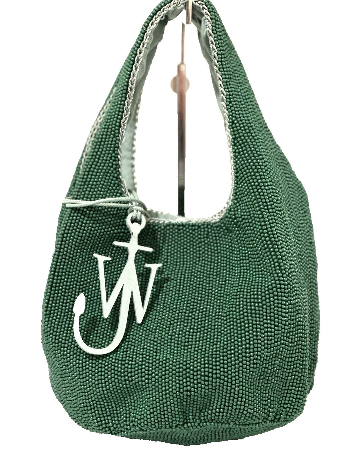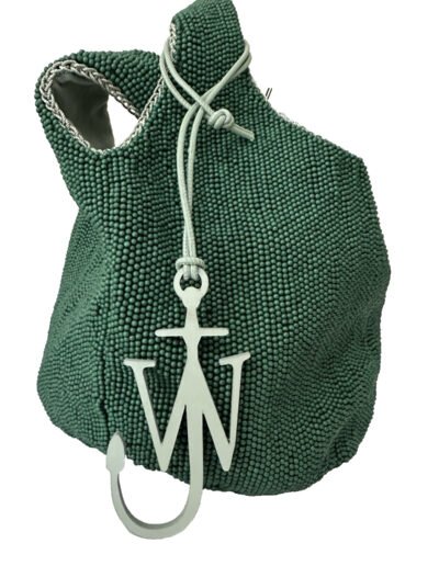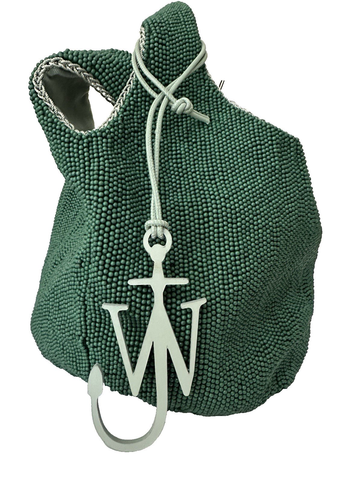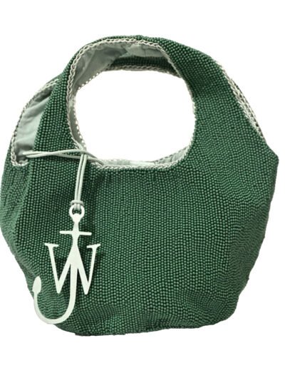 The JW Anderson Green Beaded Shopper Tote Bag is a luxurious and stylish handbag perfect for various occasions such as travel, weddings, parties, and casual outings. Made with a blend of cotton and various materials, this tote bag features intricate beaded accents and the brand’s logo. The green exterior with a blue lining adds a pop of color to the design, making it a statement piece for women looking for an original and handmade accessory. Perfect for those who value craftsmanship and a trendy aesthetic.