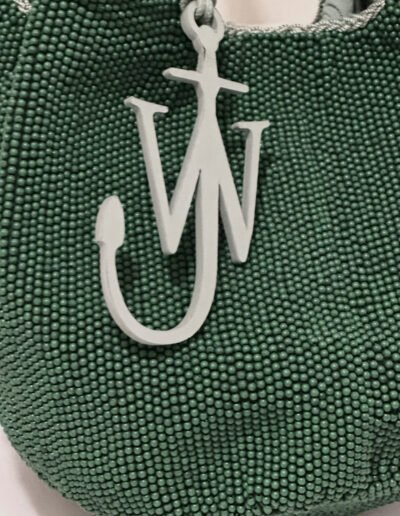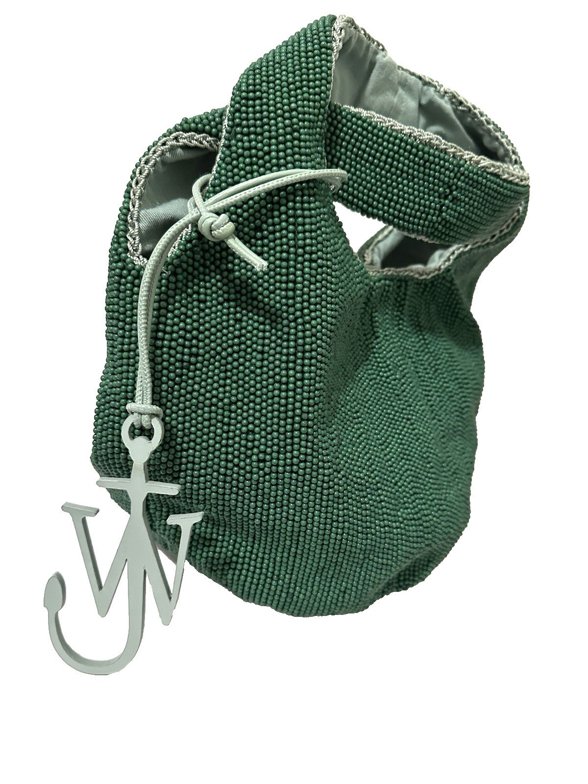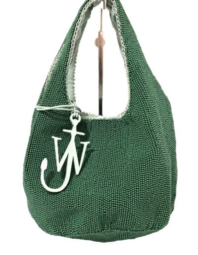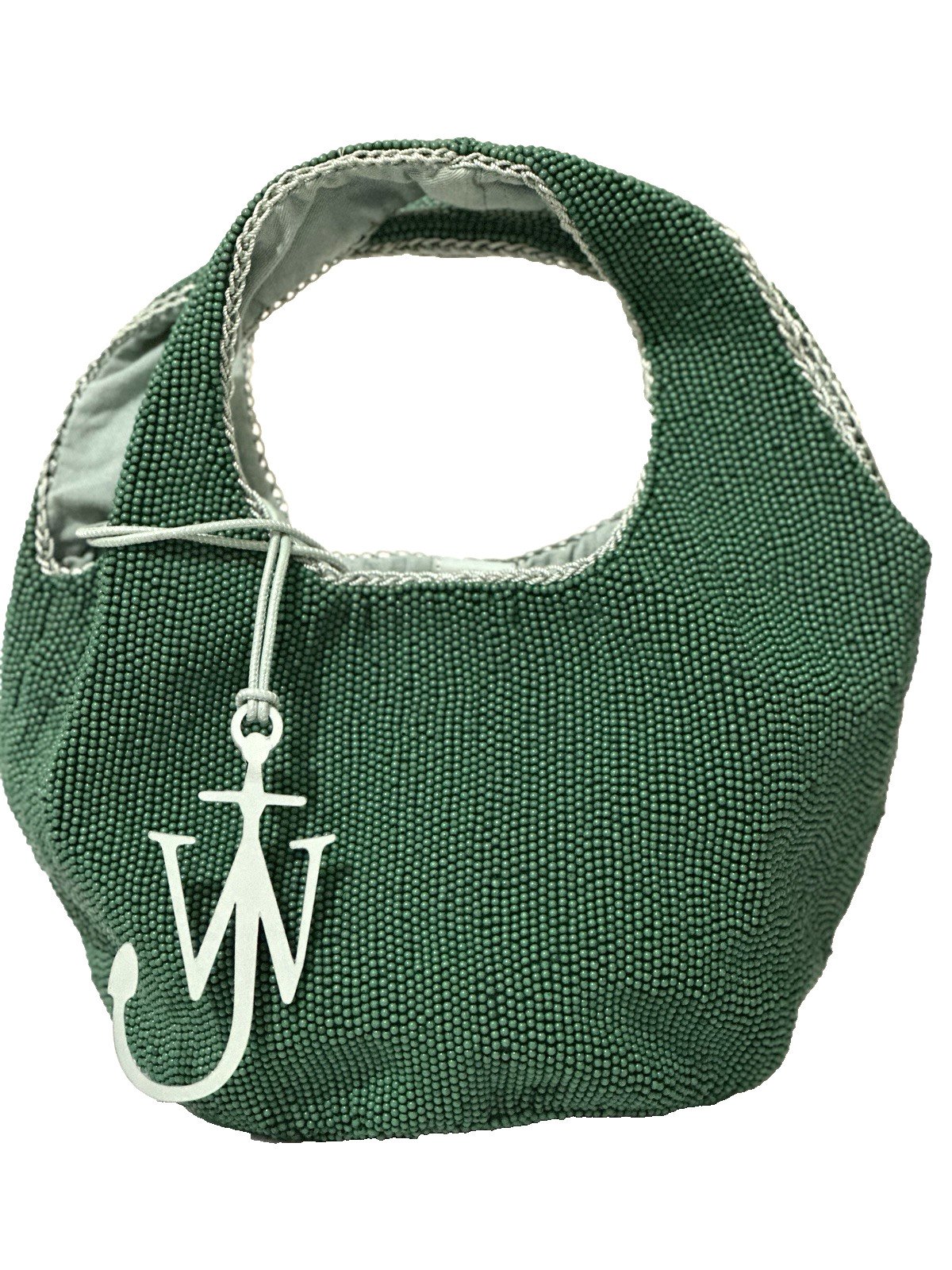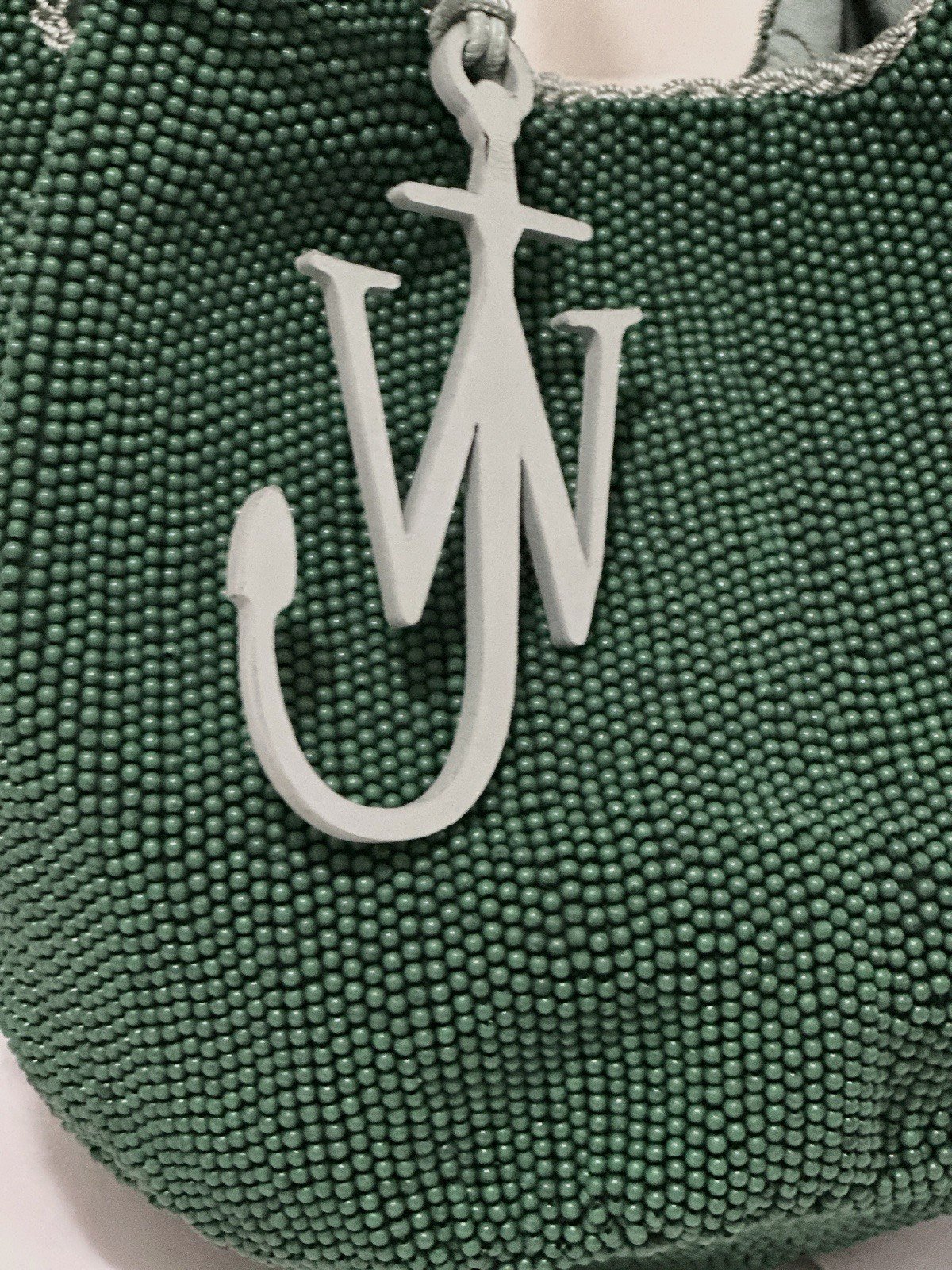 The JW Anderson Green Beaded Shopper Tote Bag is a luxurious and stylish handbag perfect for various occasions such as travel, weddings, parties, and casual outings. Made with a blend of cotton and various materials, this tote bag features intricate beaded accents and the brand’s logo. The green exterior with a blue lining adds a pop of color to the design, making it a statement piece for women looking for an original and handmade accessory. Perfect for those who value craftsmanship and a trendy aesthetic.