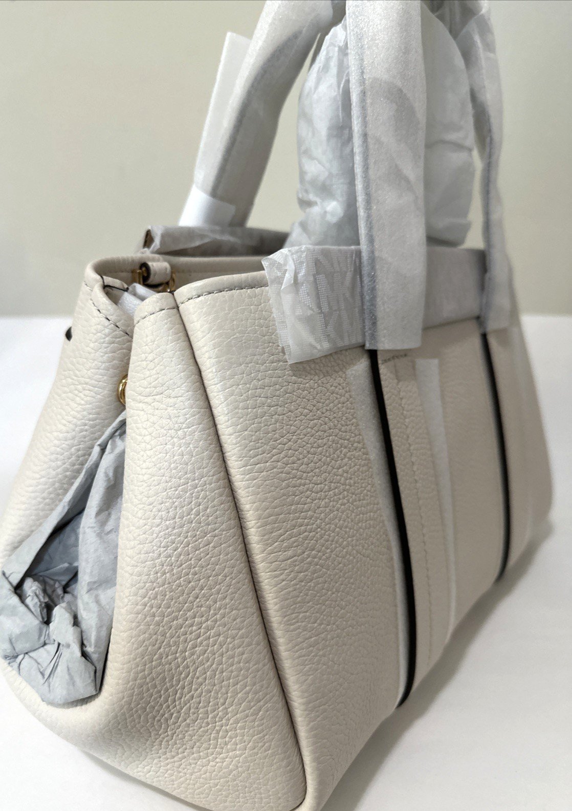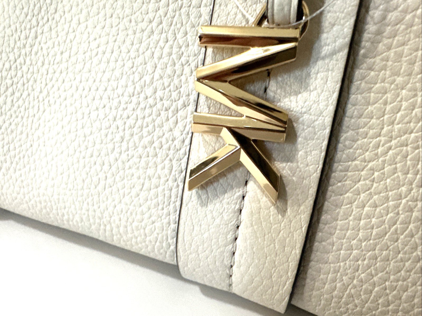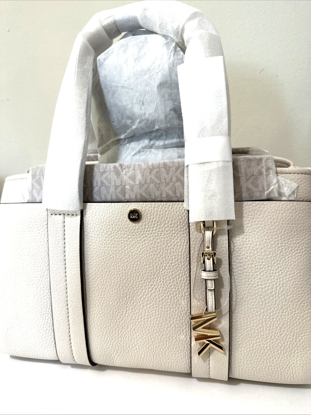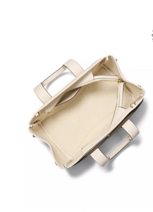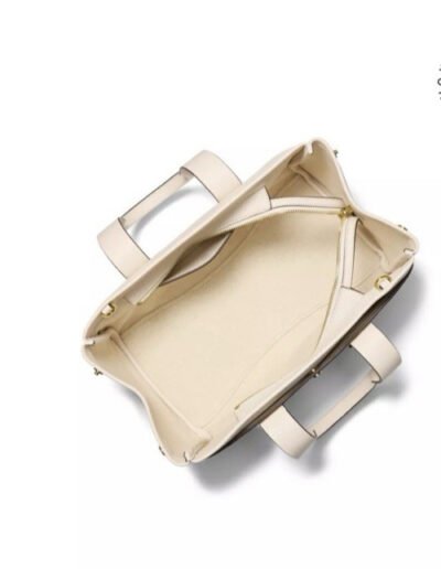 The MICHAEL Michael Kors Romee Medium Leather East West Satchel is a stylish and practical handbag designed for women. Crafted from luxurious leather with a light cream exterior color, this satchel features a top zip closure and gold-plated hardware.